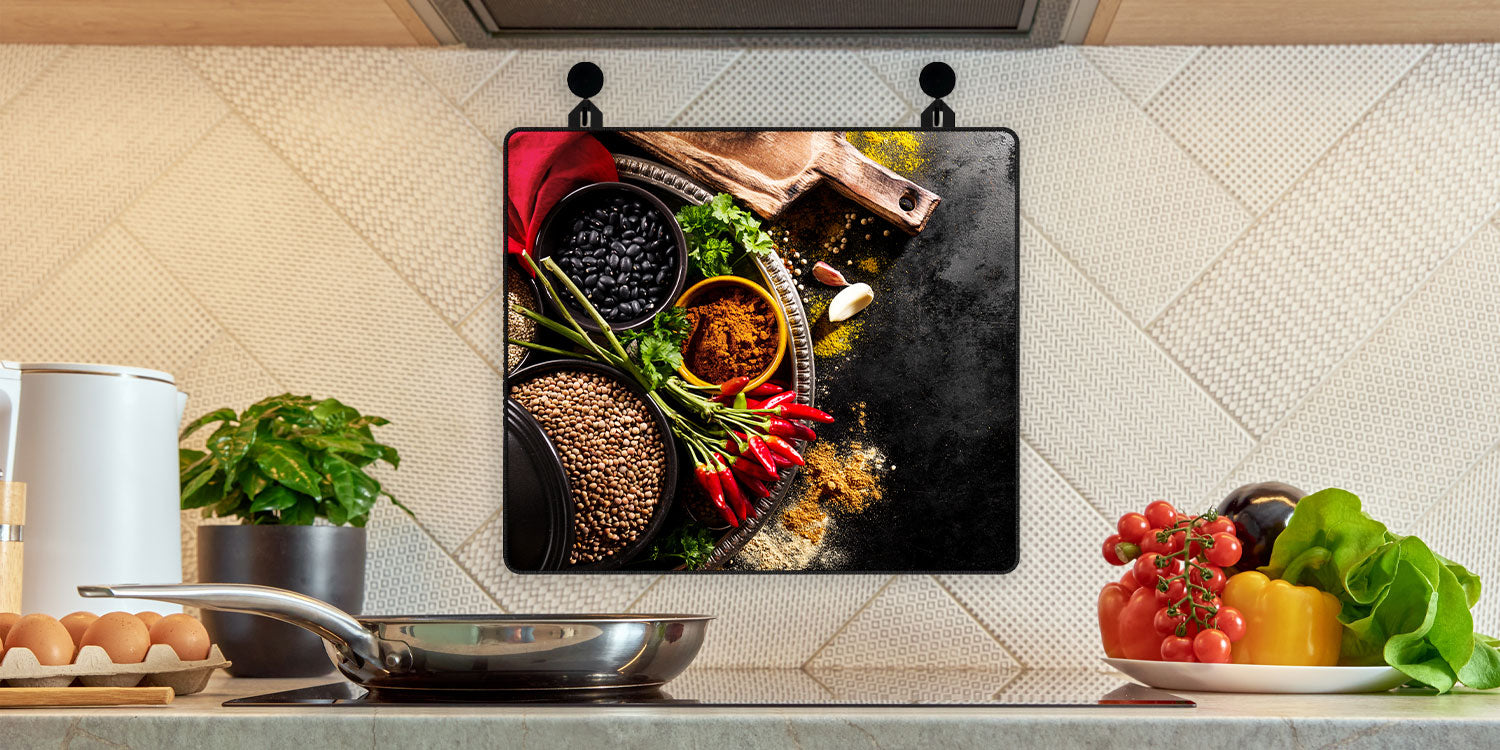 Möchtest du deiner Küche ein stilvolles Upgrade verpassen oder einfach mehr Arbeitsfläche schaffen? Dann ist diese clevere Herabdeckplatte von KitchyMist genau das Richtige für dich! Die Matte zeigt ein lebendiges Motiv mit würzigen Gewürzen – ideal, um deiner Küche einen Hauch Exotik zu verleihen und gleichzeitig dein Kochfeld zuverlässig zu schützen.